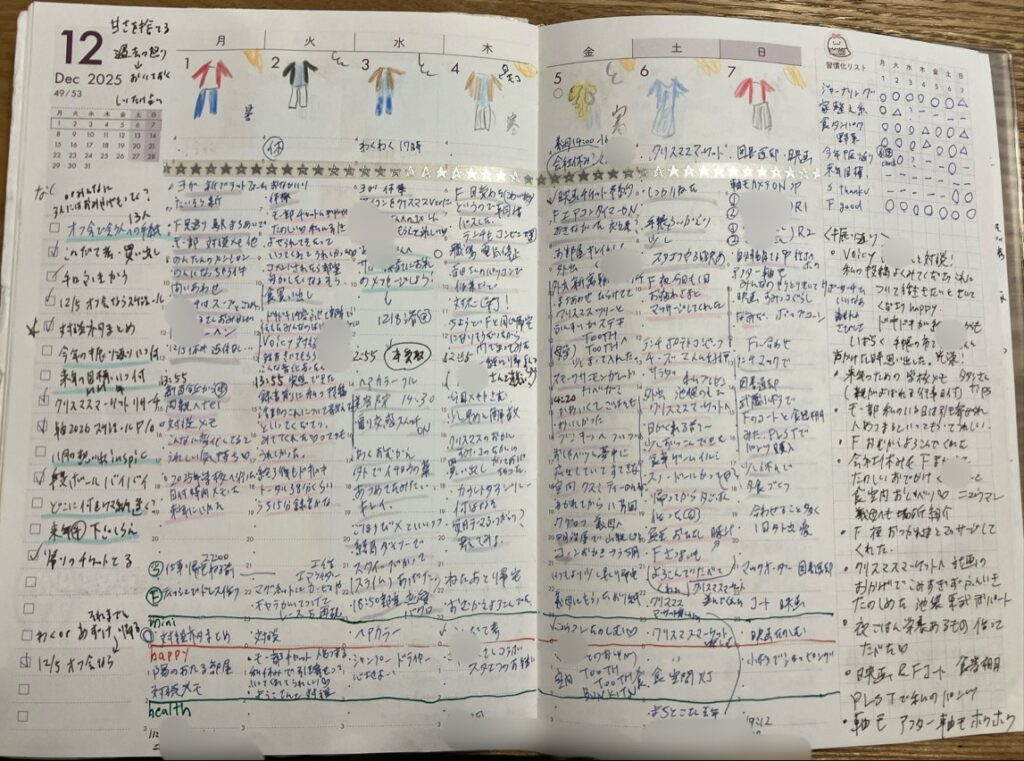 手帳って、こうやって俯瞰できるのが大きなメリットだと思うんです。だから、毎週末には「一週間の振り返り」として、記憶が新しいうちに直近の日々を俯瞰することも習慣にしていますよ。
