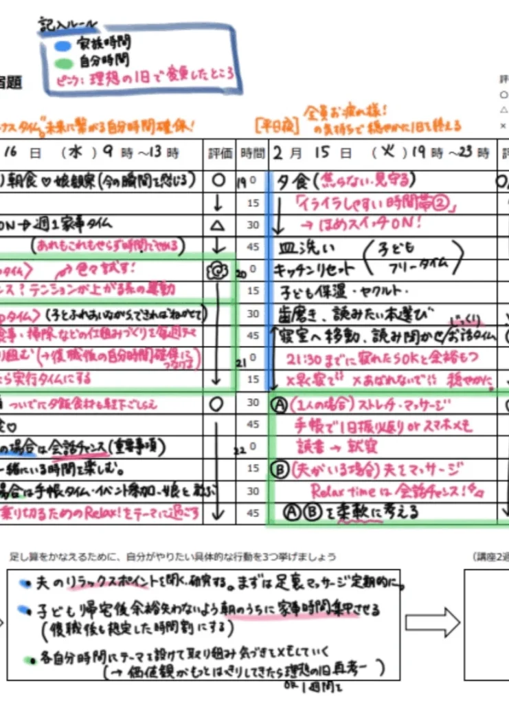 講座では「24時間の棚卸しワーク」について理解を深め、1カ月の講座を通じて自分の理想が見えてきました。