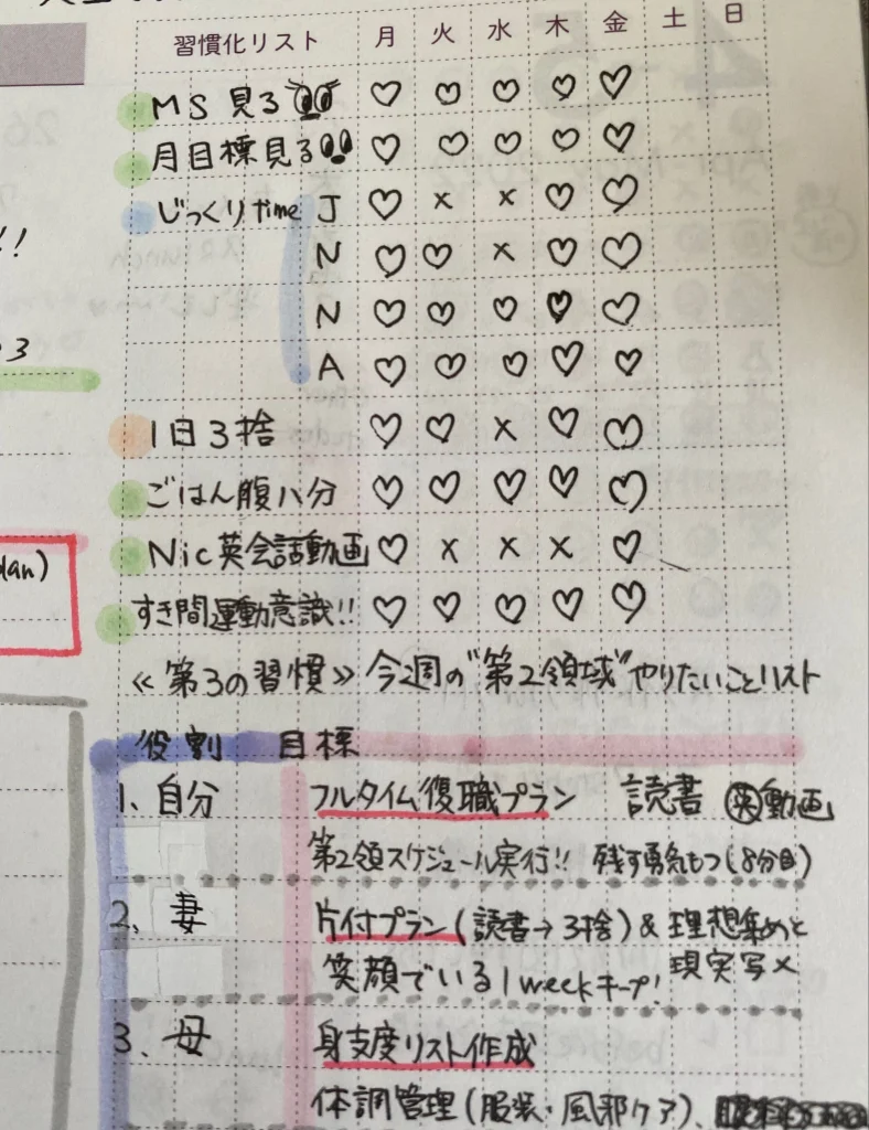 第三の習慣で自分の役割を明確にし、習慣化リストで取り組んだ。