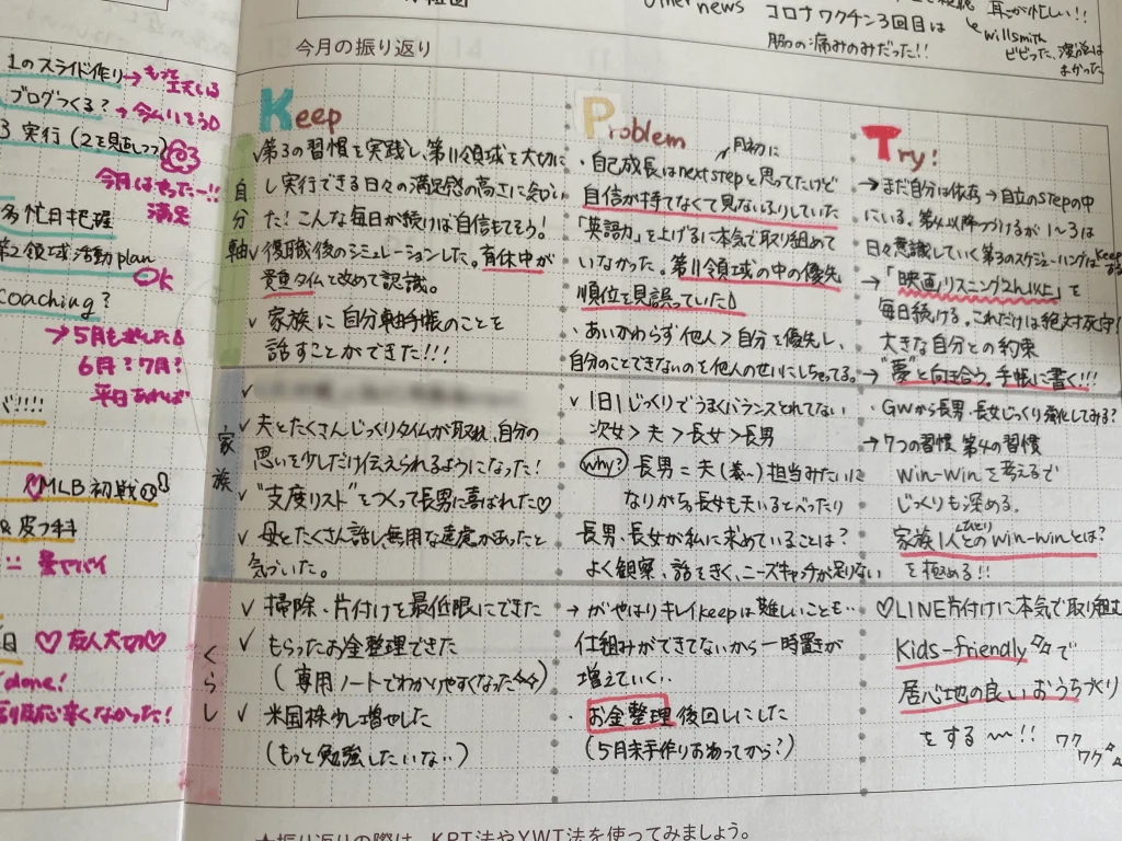 7つの習慣実践シェアに刺激受け取り組み始めて、手帳を書く目的ができました。年間目標を決めて毎月少しずつ成長感じたいと思い、必ず月の振り返りだけはしようと決めています