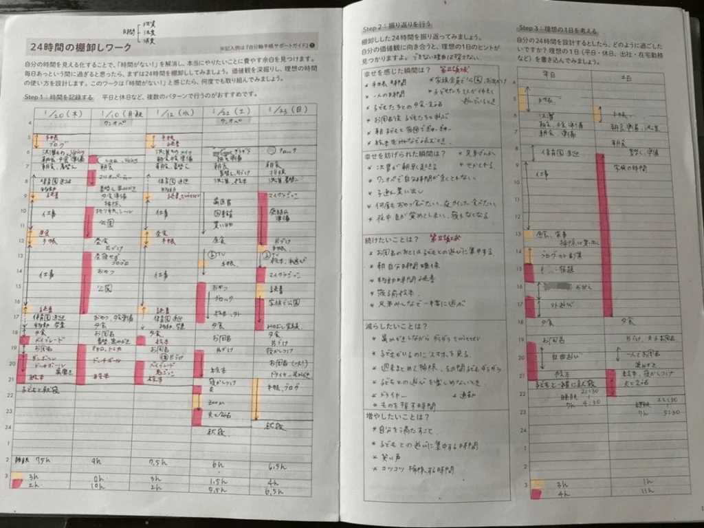 「24時間の棚卸しワーク」の「幸せを感じた瞬間」には「子どもたちと一緒に過ごす時間」と書いているのに、そこに幸せを感じられていない、ということにハッとしました。