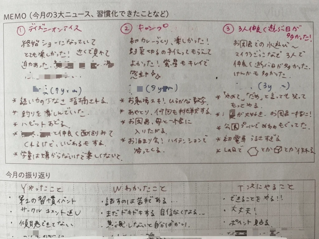 月の振り返りページでは、3大ニュースと合わせて、3人の子どものはまっているおもちゃや行事、様子を書いています。毎日、毎週だと大きな変化がなくても、前月の記録をみると、今と全く違う遊びをしていたり、書いてなければ忘れていたこともあります。