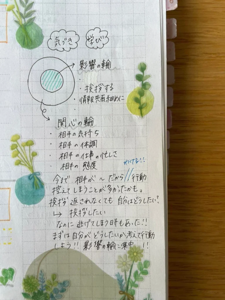 で成り立っており、「影響の輪」にエネルギーを注ぐことで具体的な行動が増え問題解決や目標に向かった前進が増える――その話を聞いたとき、衝撃を受けたんです。