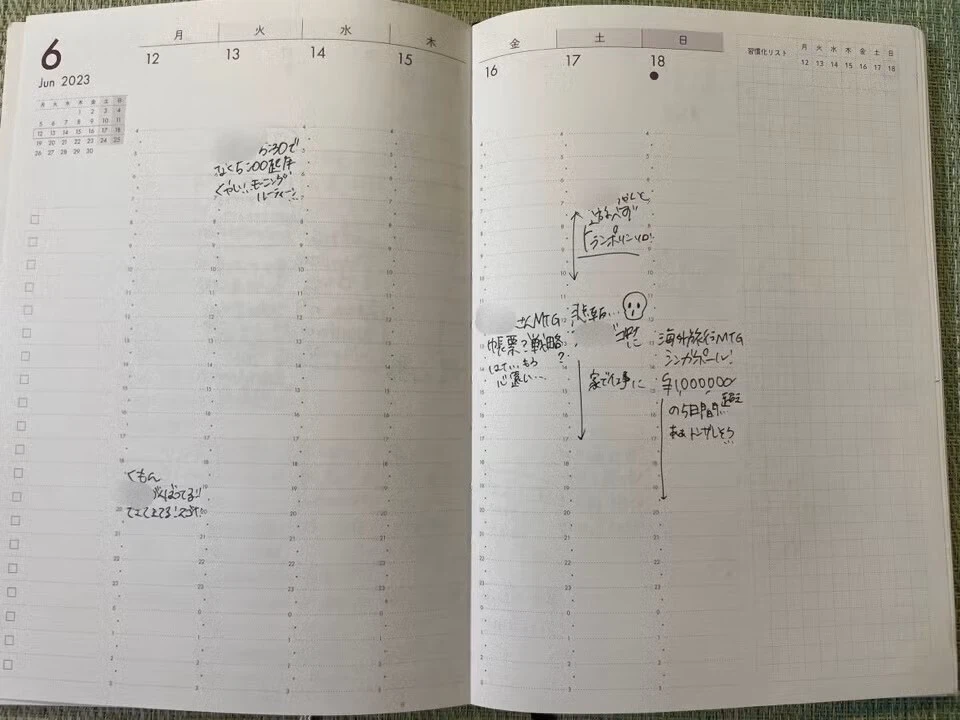 それまでの私の手帳は、ウィークリーページにある「時間軸」の表記に縛られていたんですよね。それまで「手帳=スケジュール帳」という捉え方しかしていなかったので、むしろそれが当然だと思っていました。
