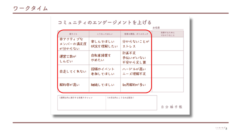 後半のワークショップでは、参加者の皆さんにご自身のコミュニティの課題とそれに対する改善方法を書き出していただきました。