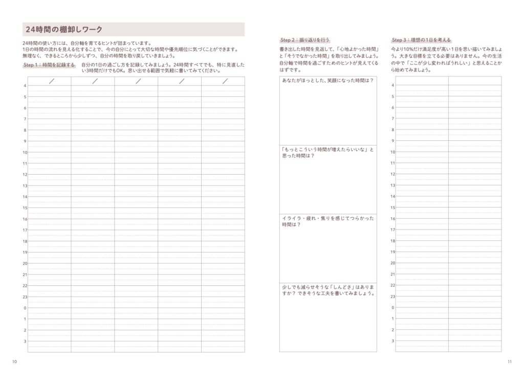 記入欄は5日分あります。ポイントは、「具体的な1日をありのままに書く」こと。「平日は6時に起きて7時に朝食を食べて8時に出勤」のように、パターンで振り返ると、小さな出来事や感情の起伏を見逃してしまいがちです。