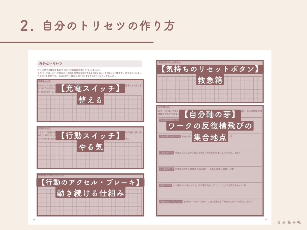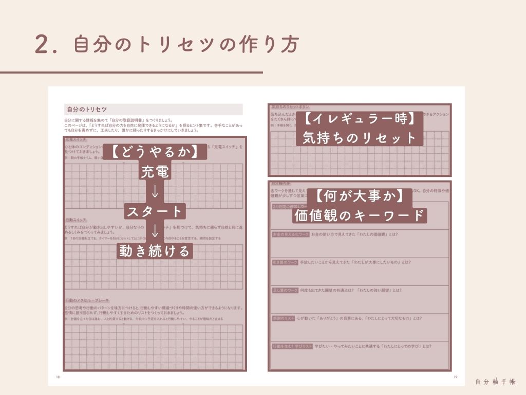 ―― 自分軸手帳ユーザーから漏れ聞こえるこんなお悩みに答えるべく、「自分のトリセツ」は以下のような構造になっています。