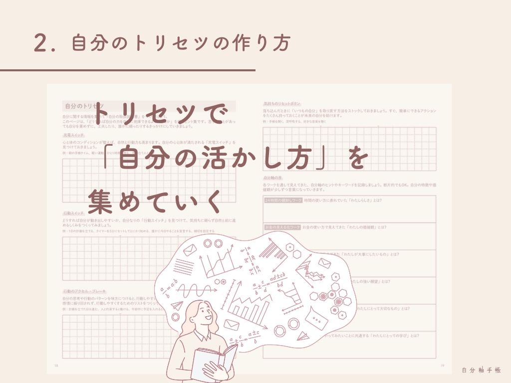 自分軸手帳をかたわらに置きながら、自分の内側に耳を傾けるうちに、あなたは徐々に“自分”の輪郭や本質を徐々に理解できる(=自分を知る)ようになるでしょう。