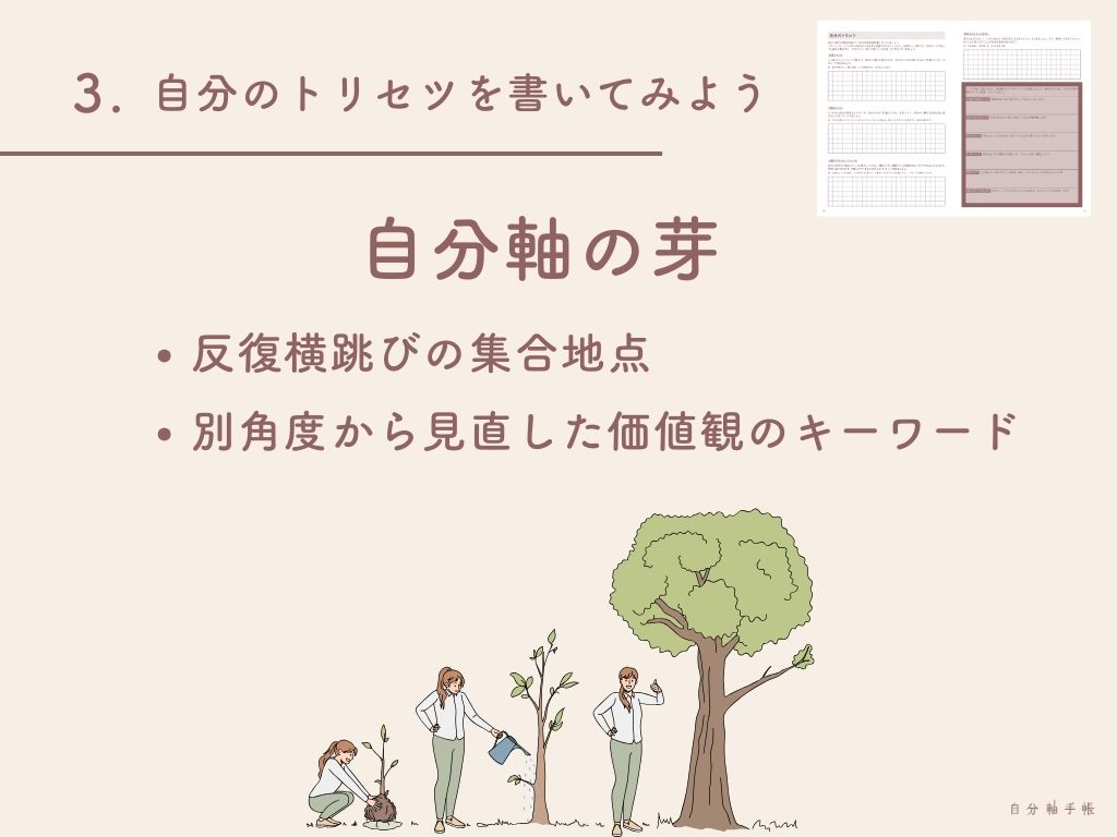 まずは一つずつ。自分だけのトリセツをじっくり作り上げて、自分軸の芽に少しずつ触れていきましょう。