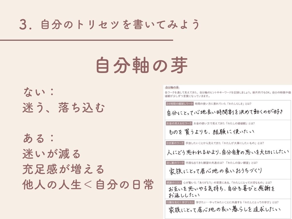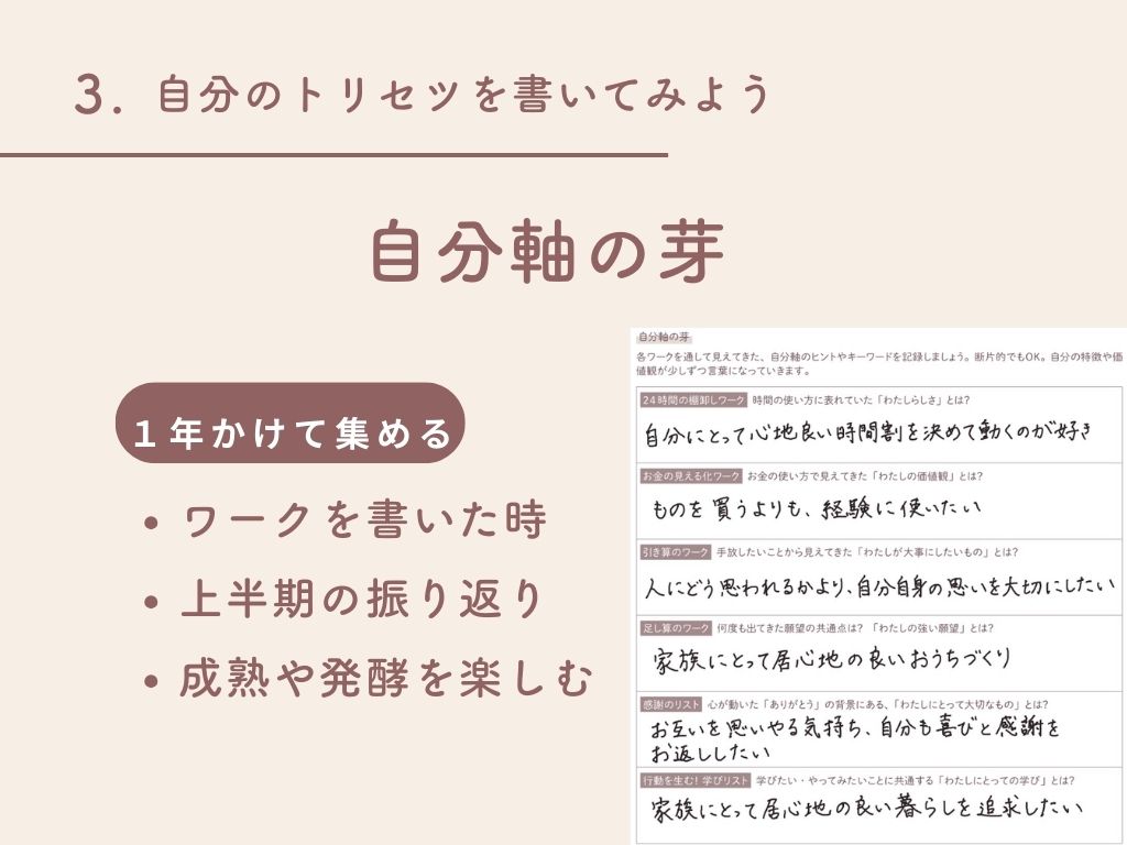「自分のトリセツ」に設けられた「自分軸の芽」は、それぞれのワークやスケジュールページと反復横跳びしながら見つけた「自分の価値観」を書き留めておく場所。