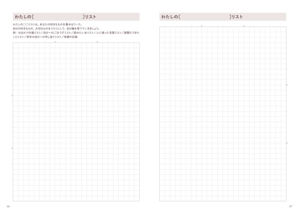 「わたしの○○リスト」(通称:わた〇リスト)は、自分軸手帳の前半部分にあるワークページの最後に位置するフリーリスト。タイトル欄+方眼のみという超シンプルなデザインで、合計4ページ用意されています。